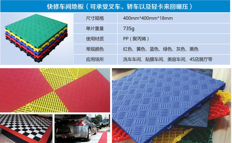A complete set of repair workshop floor is made up of main mat, male edge, female edge and corner. The mat size is 400mm*400mm*18mm, thickness is 18mm, The edge size is 400mm*60mm*8mm. Corner is fan shaped structure, size is 60mm*60mm*18mm. Repair workshop floor is lightweight and removable, easy to install. No tools needed, you can fast construct the sturdy display ground by a simple interlocking interface design.Repair workshop floor with compact structure is lightweight, easy to transport and store up. It can be used widely to auto 4s shop exhibition floor, auto beauty shop floor, auto foil workshop and customer lounge, etc. Also it can be applied to ground installation of exhibition and other temporary places, etc. It  is especially suitable for use in repair shop floor maintenance upgrade.